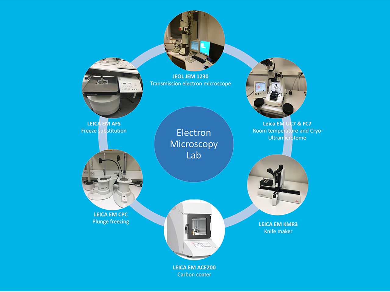 The electron microscopy lab consists of a transmission electron microscope (field emission gun operated at 100kV). Room temperature ultra-microtomes (thin sections of 200- 1000nm and ultrathin sections of 50-80nm).