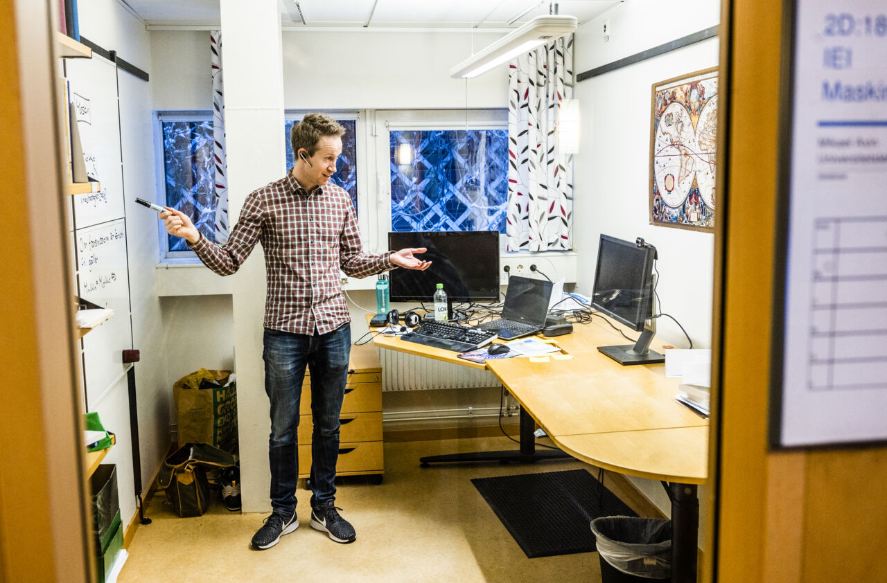 I dag har det tidigare nästan otänkbara blivit vardag. Av praktiska skäl sitter Mikael fortfarande mycket på kontoret på Campus Valla, men undervisningen sker till allra största delen digitalt. Arbetsrummet har han utrustat med extra kamera, trådlöst headset och whiteboard för sina föreläsningar. Bland grejerna finns också en mikrofonpuck som använts när hybridmöten, med vissa deltagare på plats, varit möjliga.